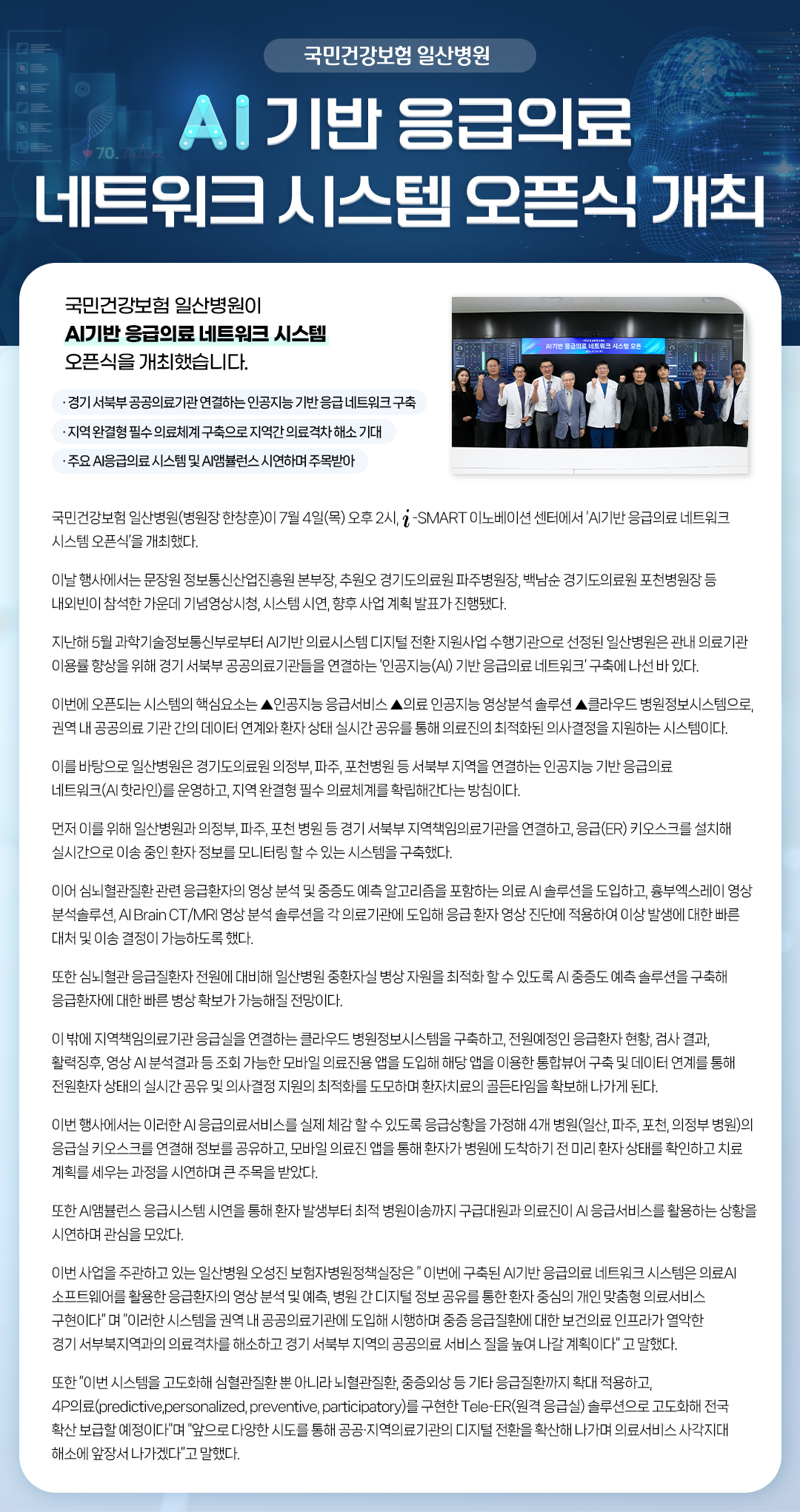 국민건강보험 일산병원(병원장 한창훈)이 7월4일(목)오후2시, i-SMART 이노베이션 센터에서 AI기반 응급의료 네트워크 시스템 오픈식을 개최했다.