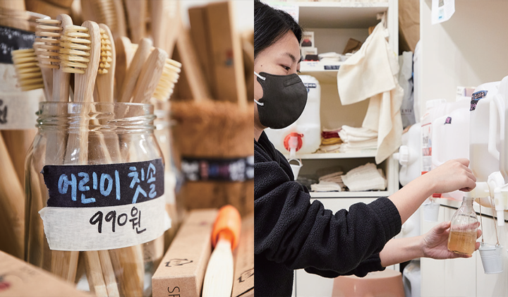 생활 속 쓰레기를 줄여줄 물건들도 판매한다. 다회용 빨대, 천연 수세미, 나무칫솔, 고체 치약, 각종 비누 등 다양한 친환경 물건이 주요 품목이다. 워시류 화장품 외에도 찻잎, 그래놀라 등도 소분해서 구입할 수 있다.