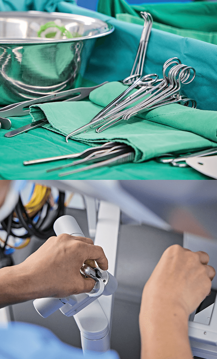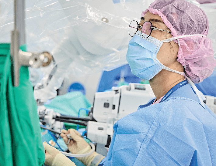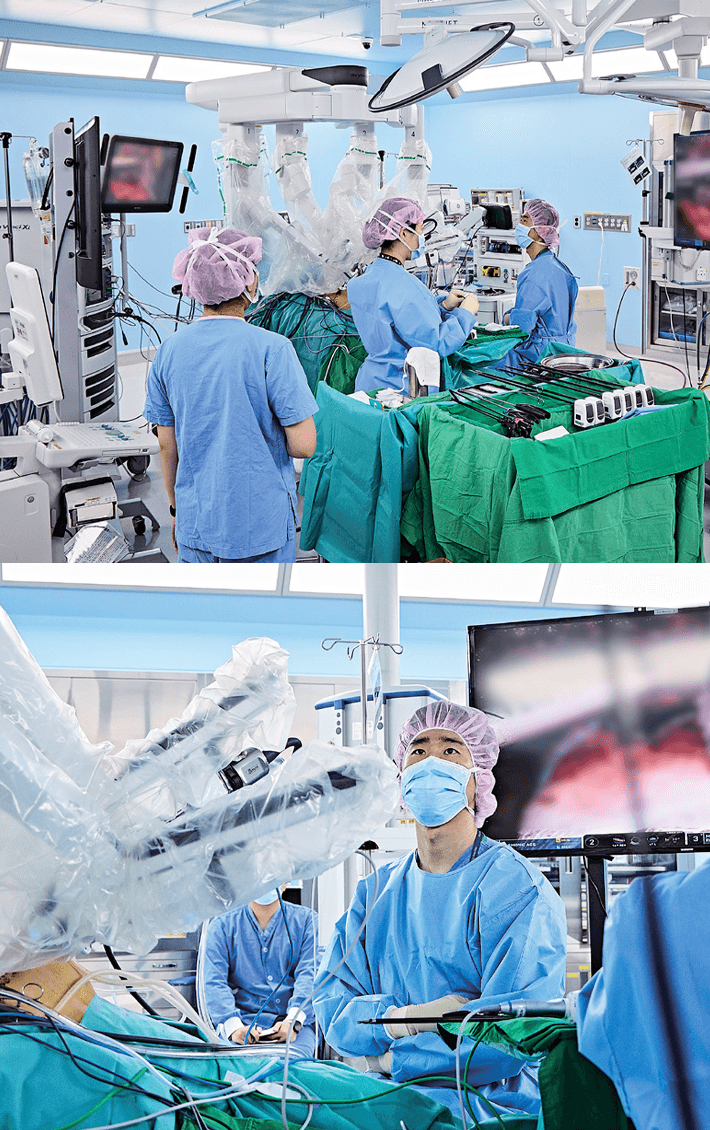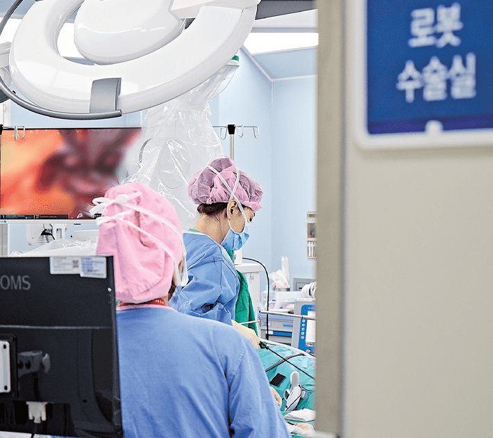 근종의 크기와 위치에 따라 수술 방법이 달라지는데, 보통 개복이나 자궁경, 로봇수술을 포함한 복강경 수술법이 적용됩니다. 로봇수술은 기존 복강경수술과 달리 3차원 입체 영상과 수술 부위 10배 확대 관찰, 미세 손떨림 보정 등 정밀한 시술이 가능해 자궁근종·자궁암 수술에서 높은 성공률과 환자 만족도를 보이고 있습니다. 최근에는 단일공(1개의 절개) 로봇수술 장비인 다빈치 SP를 도입해 더 발전된 최소침습 수술로 미용적인 측면에서 만족도와 안전성을 높여가고 있습니다.