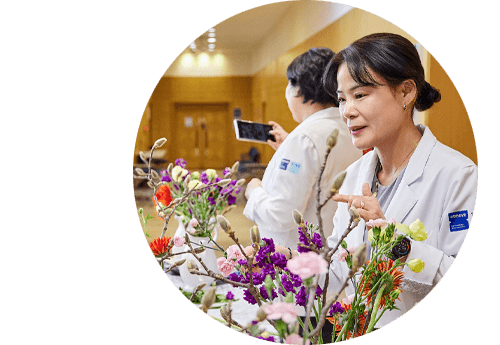 현재 화선회에는 간호, 보건, 사무 등 다양한 직군의 직원 41명이 활동하고 있으며, 정기 모임에는 약 20명 내외가 참여합니다. 모임은 지하 1층 꽃마당에서 진행되며, 외부 강사의 지도 아래 계절에 어울리는 꽃과 소재로 각자의 작품을 완성합니다. 완성된 작품은 서로 공유하며 감상하고, 병원 로비나 부서에 전시하거나 각자의 공간에서 일상을 채우는 소품으로 활용합니다. 꽃을 통해 일상이 조금 더 풍성해지는 순간입니다.