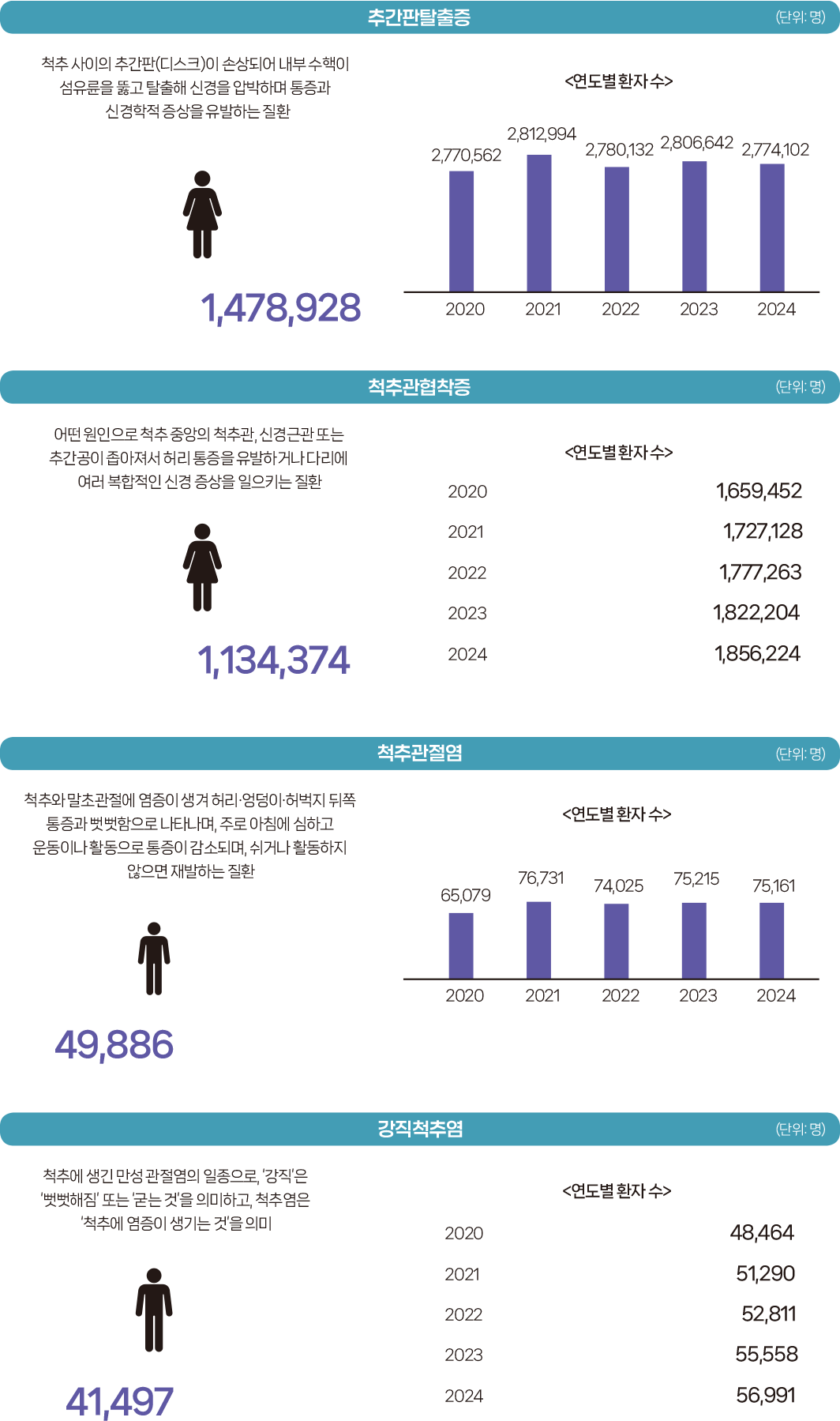 우리 몸의 기둥인 척추에는 허리디스크(추간판탈출증), 척추관협착증, 척추관절염 등의 질환이 발생해 일상생활을 위협한다. 대표 질환인 허리디스크는 환자 수가 280만 명에 육박하고 척추관협착증도 180만 명을 넘어섰다.