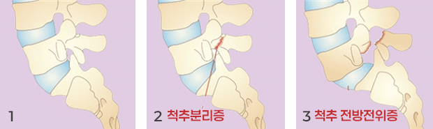 척추전방전위증은 척추 관절이 불안정해져 위쪽 관절의 척추뼈는 앞으로 밀리고 아래쪽 관절의 척추뼈는 뒤로 밀리면서 척추관이 좁아지고, 심할 경우 추간공이 좁아지면서 허리 통증 외에도 협착증 증상인 하지 방사통으로 엉덩이나 다리가 저리고 당기는 증상까지 발생합니다. 척추분리증 환자에게 발생하는 요통은 자세 변환 시 통증이 심하다는 특징이 있습니다. 주로 움직이기 시작할 때, 자고 일어나거나 앉았다가 일어설 때, 걷기 시작할 때 특히 심한 통증을 호소합니다.