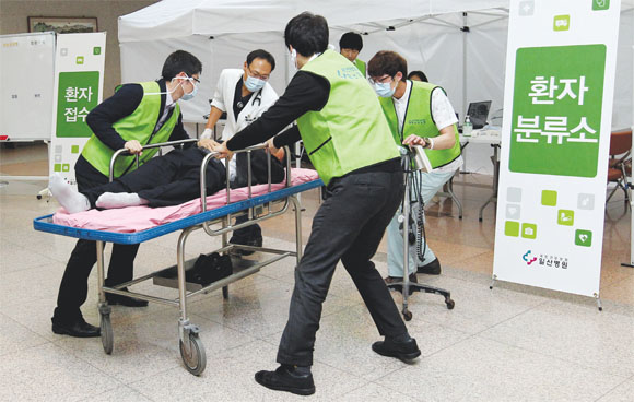 이날 훈련에 참여한 의료진, 간호인력, 행정인력은 환자 중증도 분류기준에 따라 색상별 인식표를 환자의 가슴에 부착하여 해당 진료 구역으로 신속히 이동시키는 것을 시작으로, 국내 병원으로는 유일하게 병원 로비에 마련되어 있는 Wall care zone을 활용하여 의료진이 안전한 곳에서 빠르게 환자들을 처치해 나가는 모습을 보이며 체계적이고 전사적인 대응능력을 보여주었다.