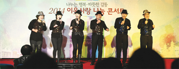 12월 4일에는 국민건강보험공단에서 열린 ‘2014년 이웃사랑, 나눔 콘서트’에서 장애인과 노숙인, 독거노인 등 문화소외계층을 대상으로 노래 ‘일소일소일노일노’를 율동과 함께 선보여 큰 호응을 받았다. 이 콘서트는 2006년부터 문화소외계층을 위해 매년 개최되는 행사로 음악적 재능을 지닌 국민건강보험공단 직원들과 각종 사회 유명인사들이 출연해 왔다. ‘100세 시대’ 팀은 이외에도 성동구청 소재의 복지관, 지하철 3호선 옥수역 등지에서 꾸준한 재능기부 공연활동을 펼치고 있으며, 최근 KBS ‘토요아침마당 가족이 부른다’ 코너의 본선 진출이 확정되는 등 실력도 인정받았다.
